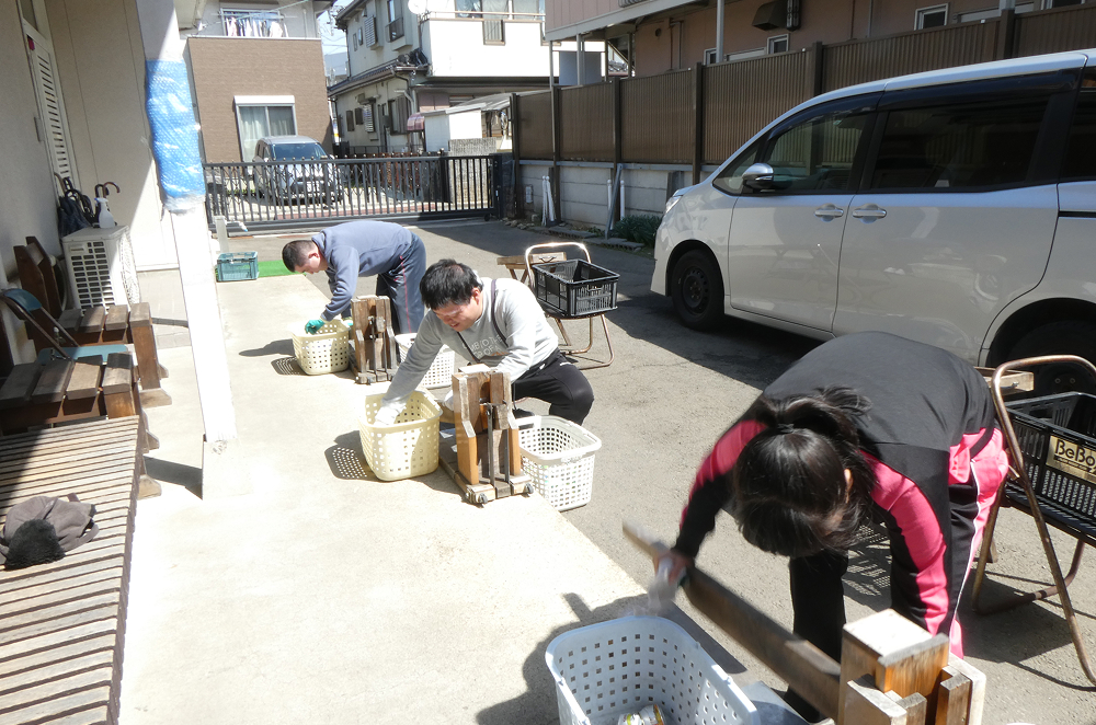 午前はアルミ缶回収、缶選別、潰し作業、午後はモザイクペグ、貼り絵、絵のれん、結び織り等を行っています。特にアルミ缶回収作業では、河原町商店街を中心に地域を回る等、地域の方々の理解と協力を頂き、地域に密着した活動を行っています。